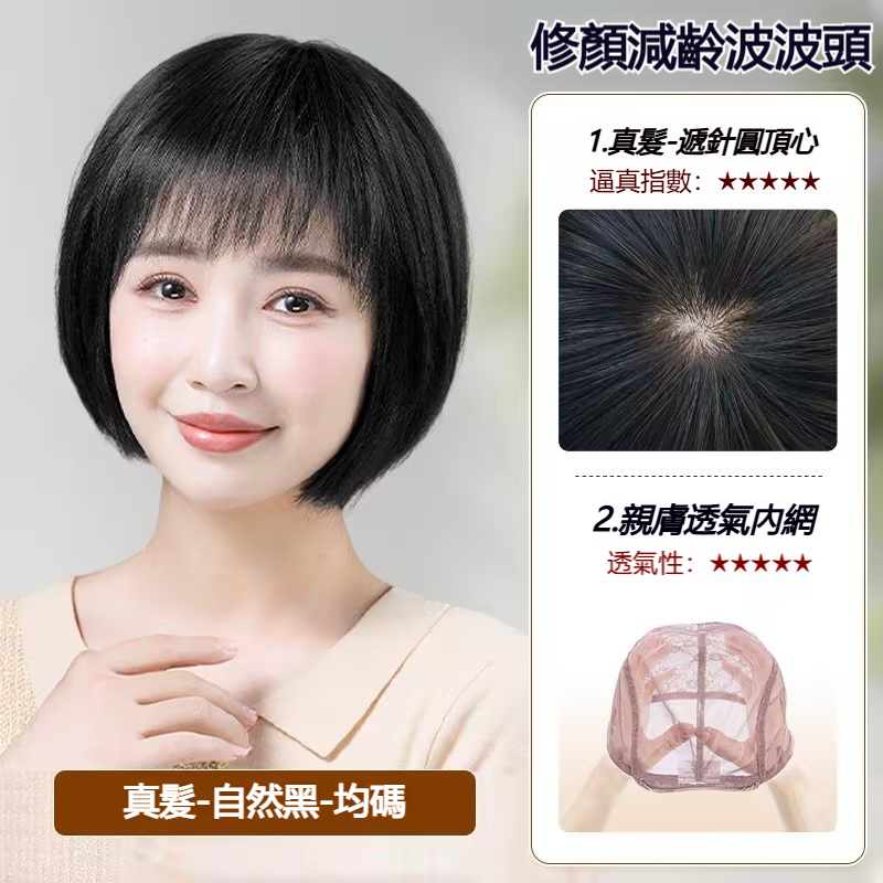 【波波頭假髮】逼真自然_透氣不悶_劇烈運動不掉落_真人髮絲_隱形無痕瑞士網_20歲-100歲_四季可戴_360°立體蓬鬆顯漂亮_保持美麗形象